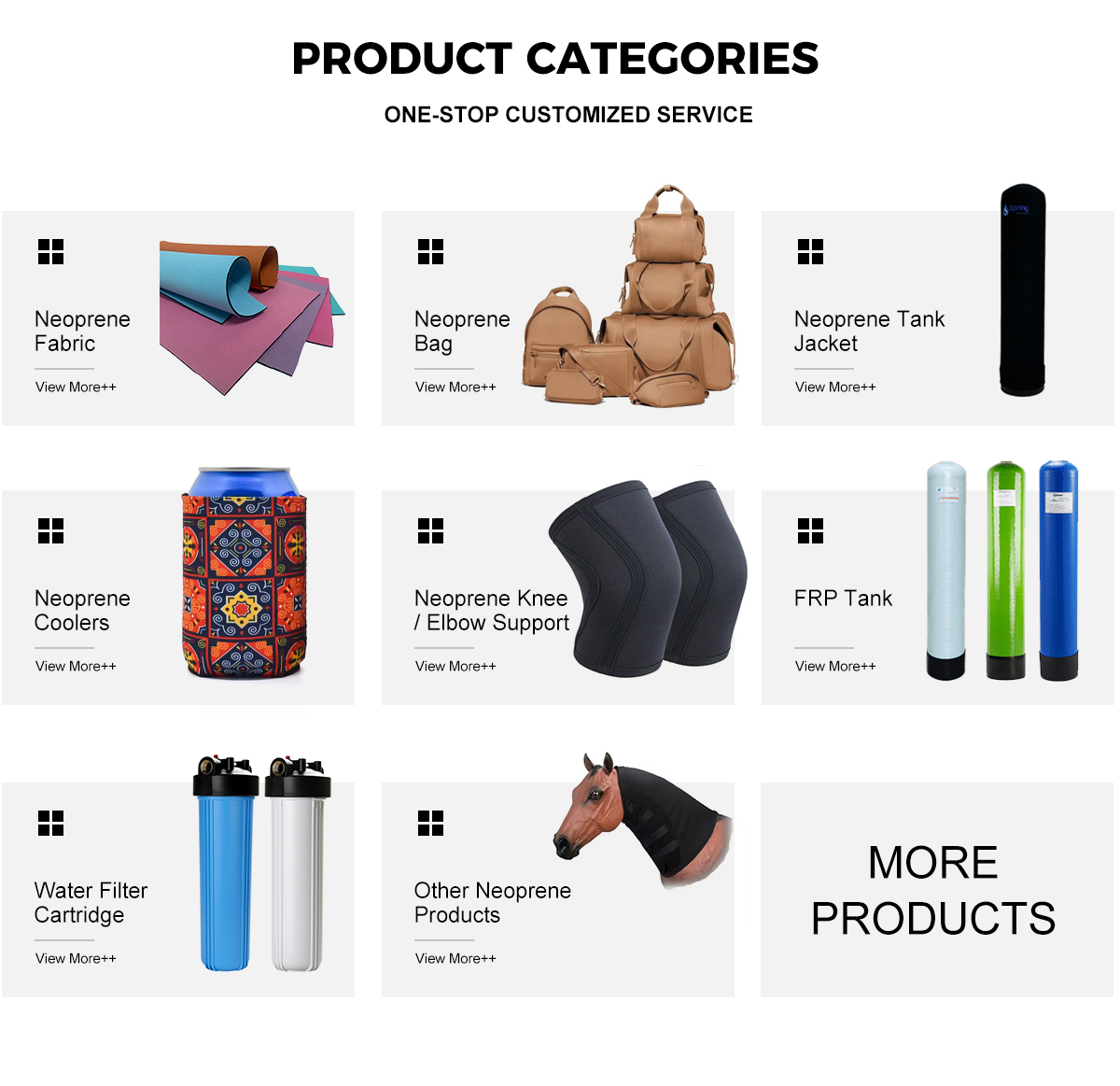Ana ürünler:Neopren kumaş, neopren Tank ceket, neopren çanta ve neopren kutu içecek soğutucusu, neopren spor güvenliği, Wetsuit